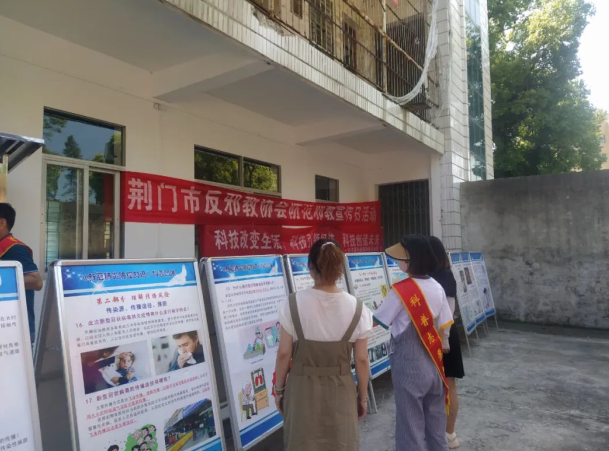活动现场,荆门市反邪教协会、市科技馆的科普志愿者们通过摆放“新冠肺炎防控知识”“崇尚科学文明 反对迷信邪教”等主题宣传展板、悬挂宣传横幅等方式,向社区居民、青少年进行科普,引来不少居民驻足观看。